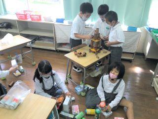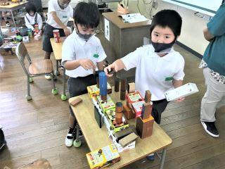 10月1日(木)3時間目授業を見回っていると、1年生が楽しそうに活動をしていました。図工かなと思ったら、算数のかたち遊びの場面でした。ビルやタワーなどをいろいろ工夫して作っていました。
