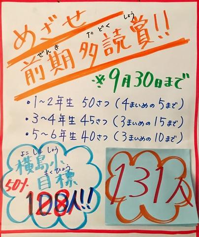 10月3日(土) 9月18日(金)にお知らせした今年度の多読賞の取組を覚えていらっしゃいますか?今年度の目標を40%(255人✖0.4=102人)として、”目指せ100人”を決め取り組んだ結果、達成したという記事です。しかし、まだ期間が残っていたので、新たに目標(50%の128人)を修正して取り組んでいました。その結果、多読賞131人となり目標を達成できました。図書委員のみんなや図書室補助員の先生、図書担当の先生の頑張りのおかげです。大変ありがとうございました。