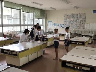 4月11日(木) 今日は身体計測がありました。1年生は高学年がお世話をしてくれていました。写真は、体育館での視力測定と家庭科室での身長計測、聴力検査を末子供たちです。
