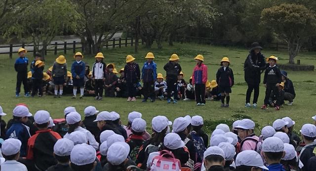 4月12日(金) 今日は1年生の歓迎遠足でした。児童会が進行をしてくれました。最初は、1年生の自己紹介がありました。そして、レクレーションは、じゃんけんピラミッドでした。じゃんけんをしながら勝ち続けると合格になります。大勢の子供たちが合格していました。その後、おいしいお弁当を食べました。