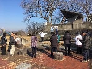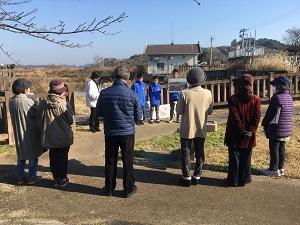 晒の船着き場や展望公園、石塘、六枚戸など、町内の史跡を巡るツアーで、担当する場所をガイドとして説明してくれました。