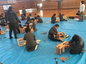 その後、間伐材を使った、本棚作りがありました。みんな、金槌を使って、釘を上手に打ち、立派な本棚を作ることができました。