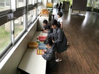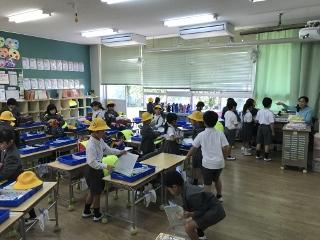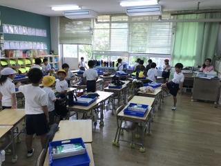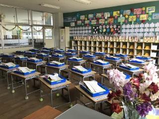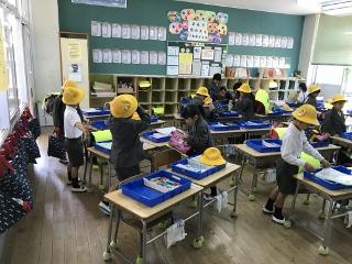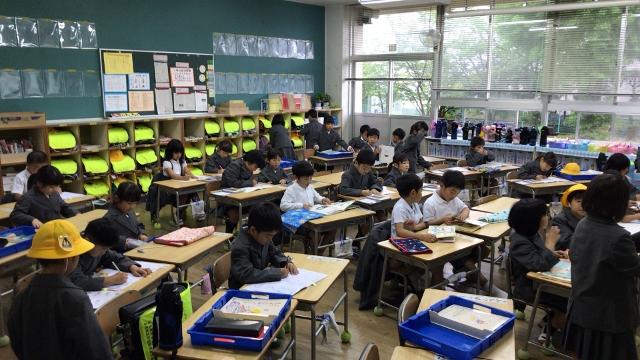 5月7日(火) 8時頃の1年生の教室です。みんな道具の片付けで大忙しです。