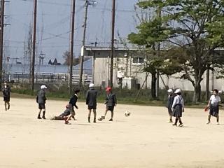 5月7日(火) 朝の運動場の様子です。横島小は、子供達が遊んでいる運動場が一望できないのがざんねんなのですが、いい場所を見つけました。音楽室から見ると一部を除いてよく見えます。