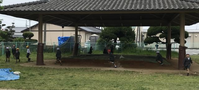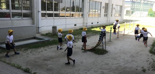 5月9日(木) 今日の昼休みの様子です。1年生が楽しそうに遊んでいました。黄色い帽子が動いていると、いつ見てもかわいいです。