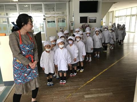 4月24日(水) 給食室での検食を終え、校長室へ帰っていると1年生が給食室へ向かっていました。みんなきれいに並んで、落ち着いた様子で歩いて行っていました。なかなか立派でした。