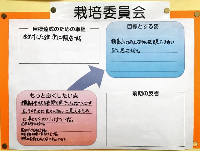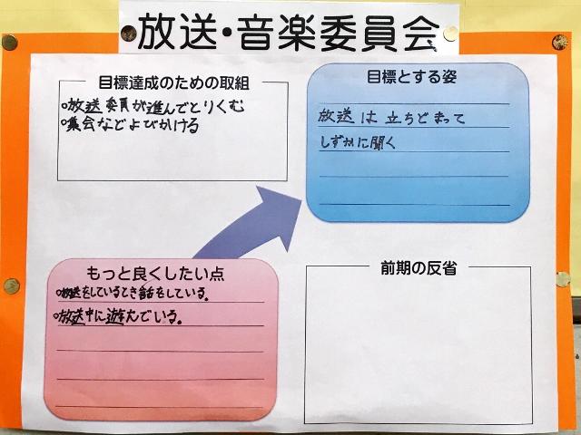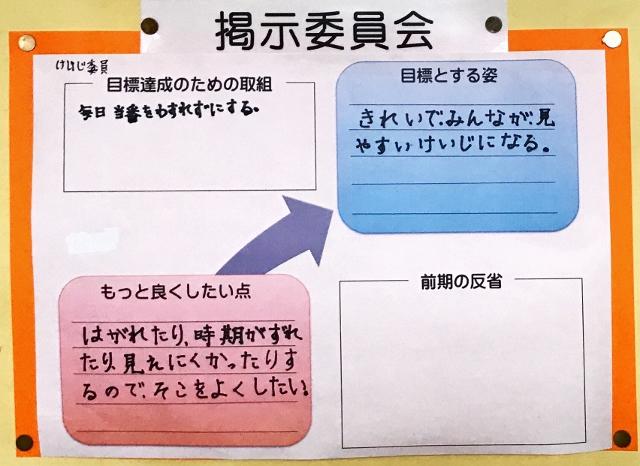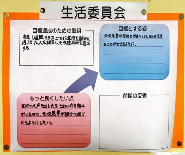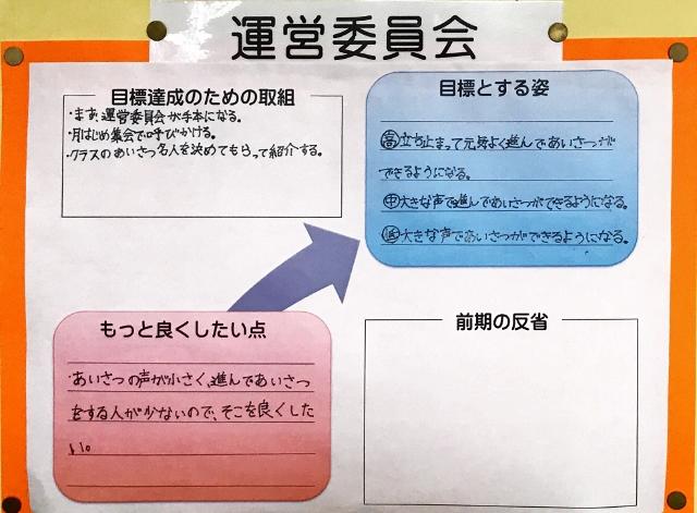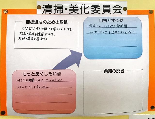 4月29日(月) 今日は、各委員会の今年度前期の目標及び取り組み計画をお知らせします。以前学校だよりやPTA総会でお話ししましたが、マネジメントシートを活用した計画です。育てたい力の「考動力」育成のための取り組みになります。この計画を評価し修正しながら取り組んでいきます。まずは、運営委員会と生活委員会、清掃・美化委員会です。