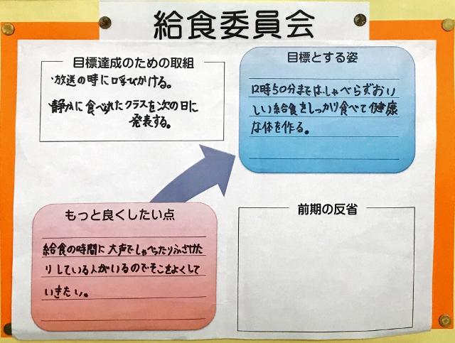 一つ目は、「昔の給食の紹介」、二つ目は、「給食がどのようにして作られているか」、三つ目は、「感謝の気持ちで食べましょう」でした。