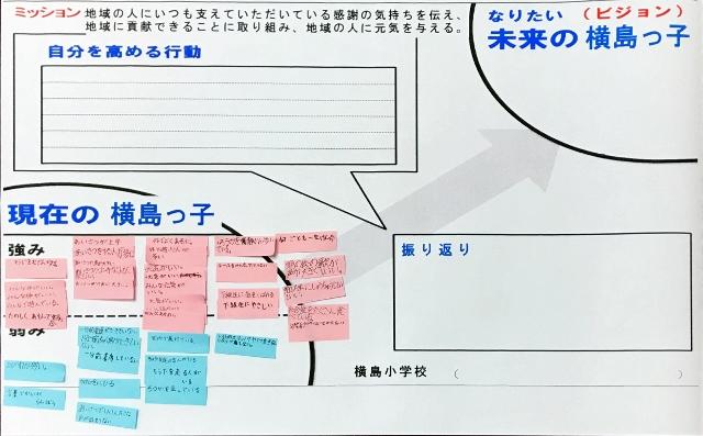 5月7日(火) 今日は、8人の運営委員の子供達に、昼休みにもかかわらず校長室に集まってもらいました。目的は、運営委員に横島小をよくするための主体的な取組を考えてもらうためです。ミッションは、「地域の人に感謝の気持ちを伝える。地域に貢献する。地域の人に元気を与える。」で考えてもらいました。1日目の今日は、横島小の子供達の強み(いいところ)と弱み(課題)を出し合いました。残念ながら話し合いの写真を撮りそびれましたので、マネジメントシートだけを紹介します。強みとして出されたのは、「あいさつが上手」「みんな仲がよい」「元気がよく外でよく遊ぶ」少数意見としては、「下級生に気を配れる」「器が大きいからすぐ仲直りできる」というのもありました。課題としては、「廊下を走る人がいる」「1分前着席ができない」「言葉遣いが乱暴」などがありました。
