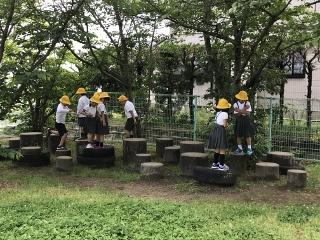 5月7日(火) 図書室横の昇降口の前に鉄棒のある小さな中庭があります。運動場まで行く時間がなかったのか、1年生が大勢遊んでいました。