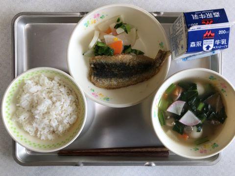 今日のメニューは、①むぎごはん ②さんまのみぞれ煮 ③ごま和え ④だご汁 ⑤牛乳です。