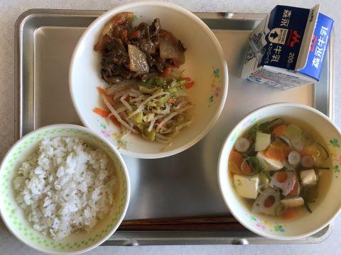 今日のメニューは、①むぎごはん ②すき焼き ③酢みそあえ ④納豆 ⑤牛乳です。今日は、健さん牛肉等提供推進事業で、赤牛の牛肉を使ったメニューでした。いつもおいしい給食なのですが、今日は一段とおいしかったです。現在は、新型コロナ感染症予防で、距離を取って一方向を向いて、黙って食べています。おいしいお肉を使った料理で少し幸せな気分になりました。