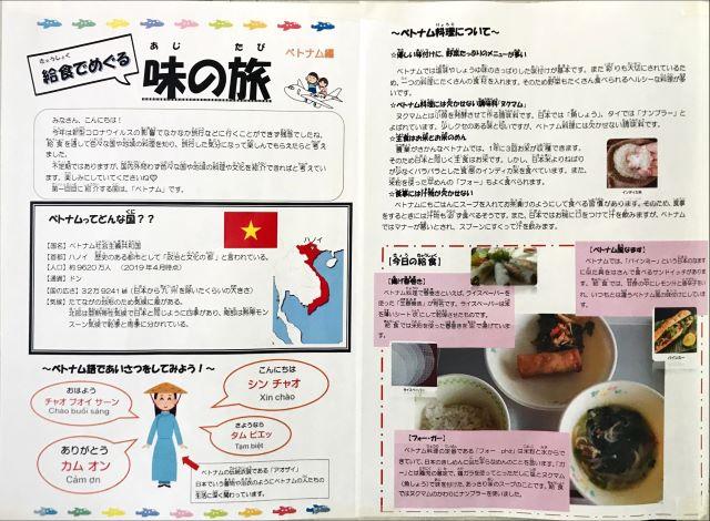 1月8日(金)少し前のことになりますが、12月22日(火)の給食は、ベトナム料理をアレンジしたメニューでした。これは、以前紹介したベトナムからの転入生に喜んでもらおうと栄養士が工夫して作ったものです。紹介が遅くなりましたが、掲示物はその時の紹介記事になります。小さくて読めないかもしれませんが紹介します。