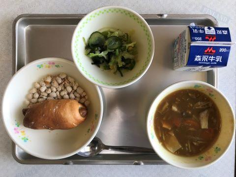 今日のメニューは、①ウィンナーパン ②きのこスープカレー ③海藻サラダ ④ミルクビーンズ ⑤牛乳です。