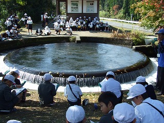 | 円形分水を間近に見ながら学習しています。 | 午後1時の放水に合わせて記念撮影 |
