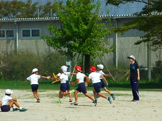 | 2年生のシャトルランです! | 1年生は手押し車で補強! | 4年生はリレー |