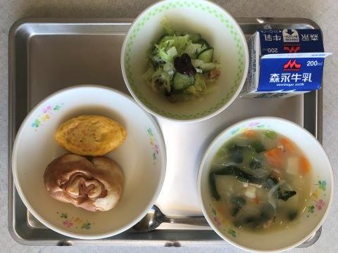 今日のメニューは、①手作りハムロールパン ②オムレツ ③豆サラダ ④ポテトオニオンスープ ⑤牛乳です。