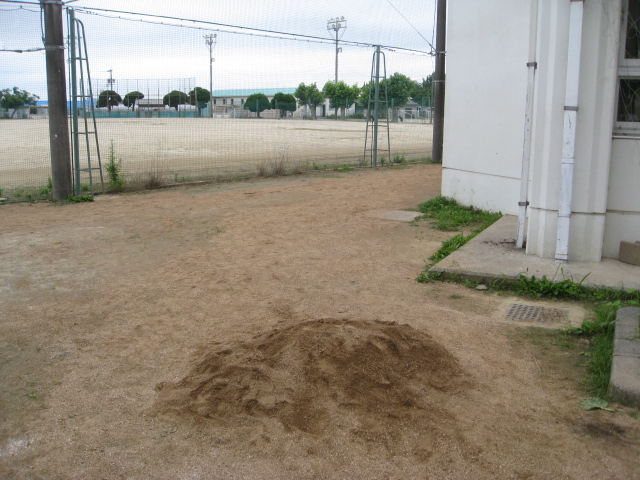 6月23日(火)今年は雨が多く、校庭のあちこちに水たまりができたり、ぬかるんだりして、すべりやすくなっていたので、低くなっているところに土を入れました。昨年の夏休みにも作業で土を入れましたが、先日の雨でまた大きな水たまりができていました。