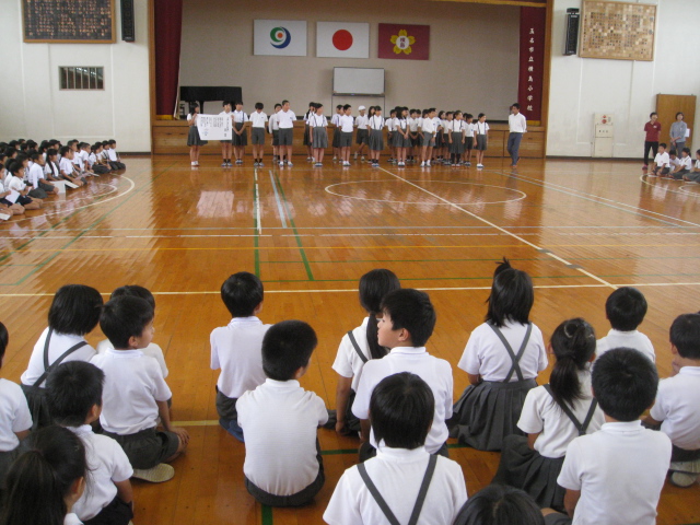 5月13日(水)児童集会がありました。体育委員会が、代表委員会で各クラスから持ち寄った意見の中から決まった運動会のスローガンを発表しました。いよいよ運動会が近づいて、運動会に向けて盛り上がって来ています。