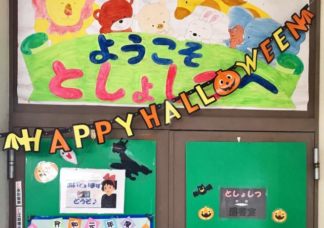 10月31日(木) 図書室前の掲示物です。秋の気配とハローウィンです。