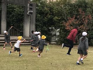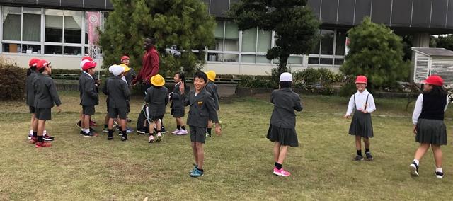 11月19日(火) 昼休みのグリーンステージです。ALTのとボーレ先生と鬼ごっこをしている子供達と縄跳びを練習している子供達が、楽しそうに遊んでいました。