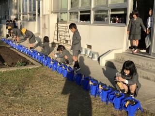 11月20日(水) 朝のグリーンステージの様子です。縄跳びをしている子供、鬼ごっこをしている子供、チューリップとアリッサムに水をかけている子供達がいました。