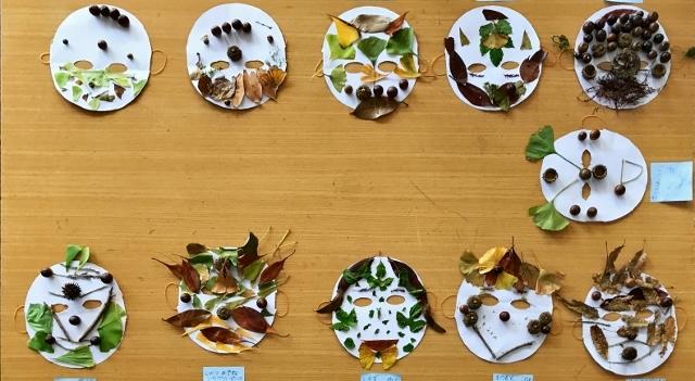 10月29日(火) 1年生が、ドングリや紅葉した葉を使って工作を作っています。秋を感じさせる工作です。