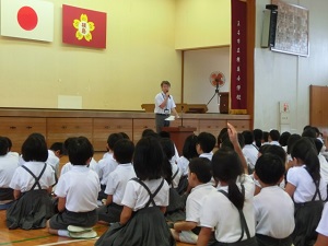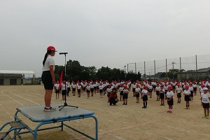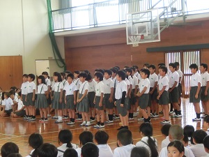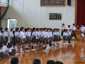 全校集会では、楽しかった夏休みの思い出を聞きました。