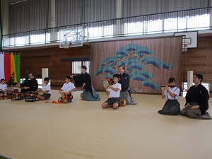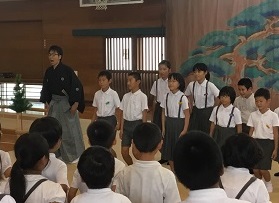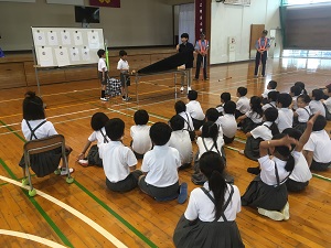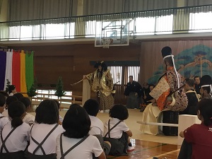 観世九皐会の皆さんがおいでになり、体育館で、狂言「柿山伏」、能「船弁慶」を演じてくださいました。日頃、なかなか見る機会がないと思いますので、貴重な経験ができたと思います。子どもたちの体験のコーナーもあり、動きや楽器の演奏などをさせていただきました。