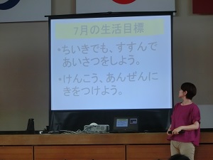 また、前期後半も、大きな事故や命の危険にあわないように、交通ルール守ったり、危険を判断したりして、命を守るようにしてほしいこと、気持ちのよいあいさつをしてほしいことを話しました。