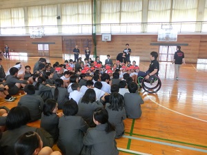 講師として、シドニーパラリンピック車いすバスケットボール日本代表チームでキャプテンを務められた、根木慎志さんをお迎えし、講演を聴いたり、車いすバスケットの体験をしたりしました。