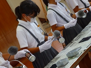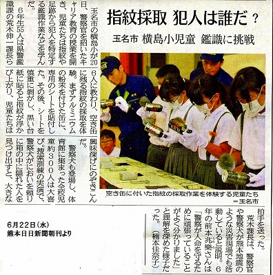 6年生は、鑑識の体験もしました。コーヒー缶に残った自分の指紋を、採取するようすが左の写真です。