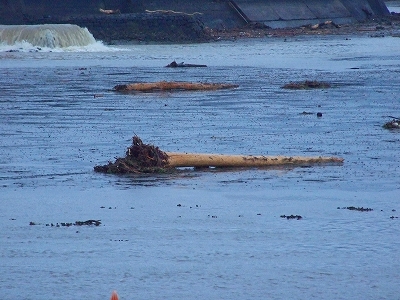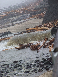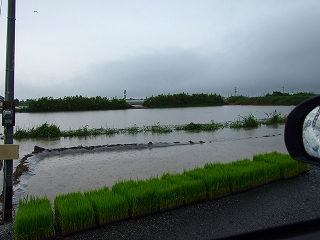 | 昨日の朝報告した横島港の排水設備です。今日は、昨日の報告とは違うもう一つの排水設備が稼働していました。 | 川と田畑の境目が分からないくらい増水していたところもありました。 |