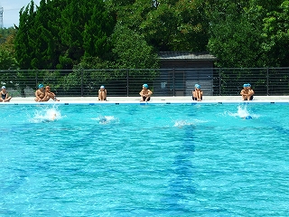 写真は高学年のプール開きのようすです。空がすっかり夏ですね。