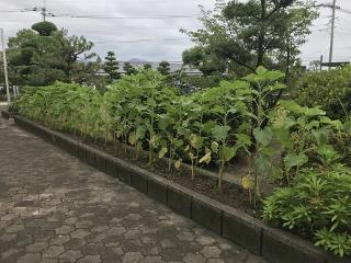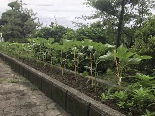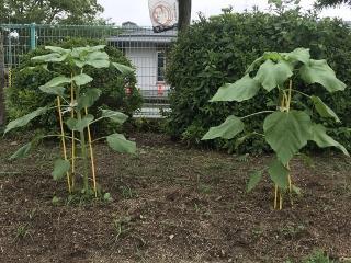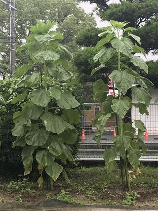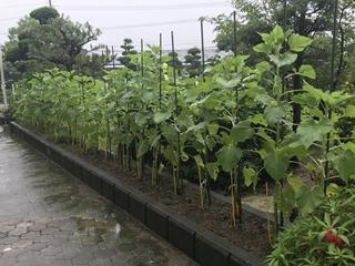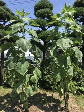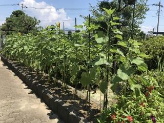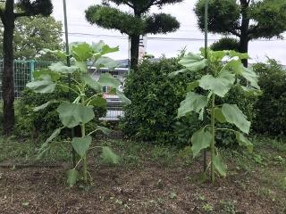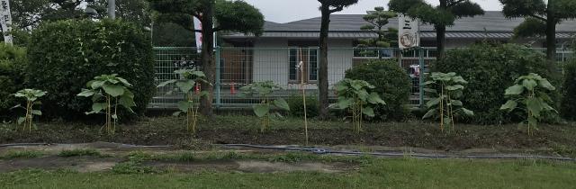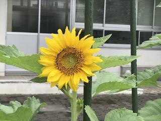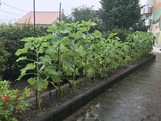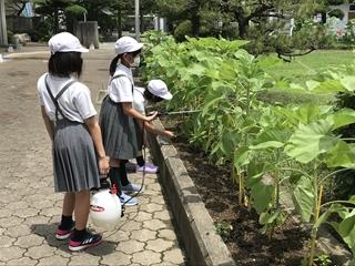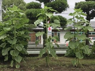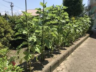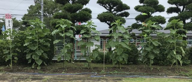 7月10日(金) 草丈2m35cm、一番高いところ2m50cm 花が咲こうとしているのもあります。目標まで、あと1m50cmですが、厳しいかもしれません。3年生のひまわりには、担任の先生方が、支柱を立てられました。プロジェクトを進めている3人の女の子達が、酵素をかけたり毎日水掛をしたりしてお世話をしてくれています。3年生の子供達も草取りをしてくれています。