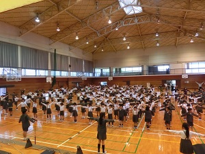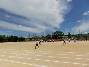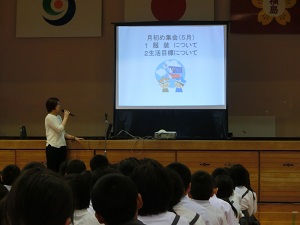 5/2(水) 月初め集会がありました。校長先生、生徒指導の先生のお話があり、運動会に向けて体育委員を中心にラジオ体操の練習をしました。また、運動会で歌う校歌と「ゴーゴーゴー」を練習しました。とても上手に歌えました。