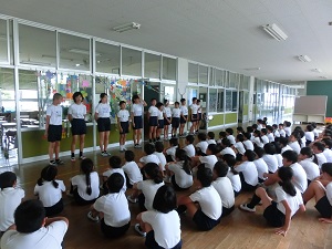 9/4(火) 9月の月初め集会がありました。まず、ALTの先生の紹介がありました。英語と日本語の両方で自己紹介をしてくださいました。生活指導の先生のお話や、放送・音楽委員会の発表があり、最後にみんなで「歌えバンバン」を歌いました。1年生が元気良く歌ってくれました。