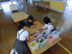 5/7(月) ゴールデンウィークあけの月曜日、大きな事故や怪我もなく、みんな元気に登校できました。あいにくの雨で、外で遊べないので、休み時間にはブロックやすごろくで室内遊びをして楽しみました。