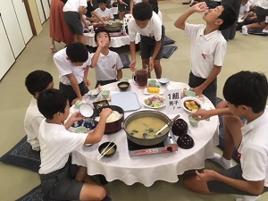 2/15(金) 先日、JAたまな女性部より手作り味噌をいただきました。今日は、そのお味噌を使って作られた給食を、教育委員会とJAたまな女性部の方と一緒にいただきました。今日のメニューは豚汁でした。おいしいお味噌をありがとうございました。