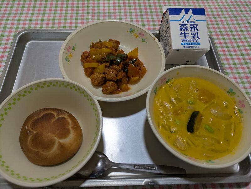 今日のメニューは、手作り丸パン、南瓜のポタージュ、肉団子のケチャップ炒め、牛乳でした。