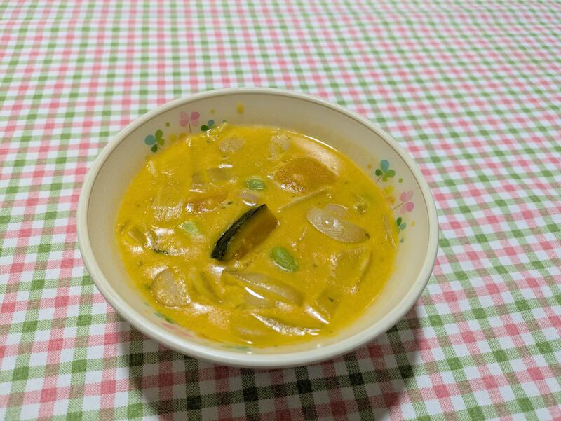 南瓜のポタージュは、スープに溶け込んだ南瓜と玉ねぎ、人参、枝豆、それにウインナーが、濃厚な味を作り出して、温かくて優しい、おいしいスープでした。丸パンにつけて食べてもおいしかったです。