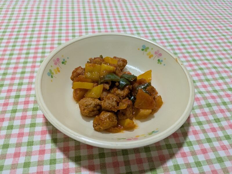 肉団子のケチャップ炒めは、ミートボールを玉ねぎやピーマンと一緒に特製のケチャップソースで炒めてありました。おいしくて、子どもたちが大喜びする味付けでした。残ったソースを丸パンにつけてもおいしかったです。