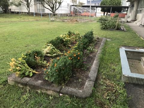 9月3日(木) 朝学校を見て回ると、ほとんど被害はあっていませんでした。花壇の花が押し倒されていたり、一部に草木が蕗黙っていたりしているぐらいでした。被害が少なくて良かったのですが、10号は大きな台風で直撃する可能性も出てきています。十分な注意が必要です。写真は、花壇の様子です。