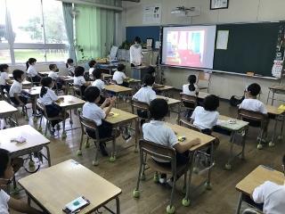 9月4日(金) 今日は今年度初めての読み聞かせでした。感染予防のため前に集まらずにマスクを付けたままで行っていただきました。子供達は、とても楽しみにしていたので、大喜びでした。私のミスで一学級写っていませんでした。申し訳ありません。