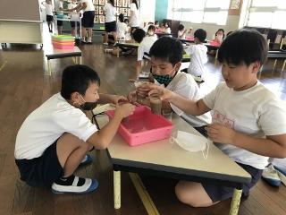 10月7日(水)2校時授業を見て回った時の様子を2つ紹介します。一つは、3年2組の理科「スライムを作ろう」の発展学習の様子と1・2年生合同体育「むつごろうどん」の練習の様子です。発展学習では、意欲的な姿が見られました。また、1・2年生の合同体育は、2年生から1年生に技術を伝える形で行われていました。