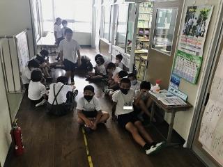 9月10日(木) 5校時授業を見て回っていると、4年生が廊下で理科「雨水の行方」の実験をしていました。砂を入れたコップに水を入れて、どんな風にしみこんでいくかを観察していました。