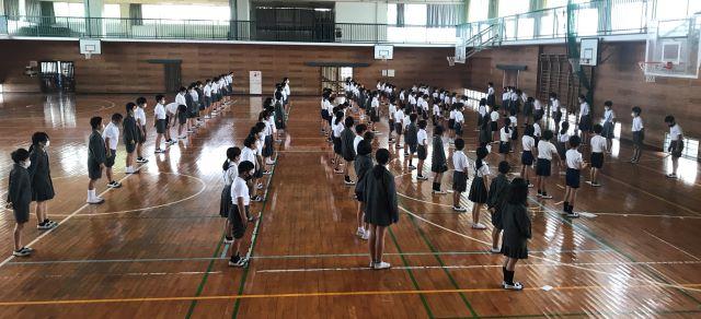 9月25日(金)5校時9月集会を行いました。私から登校指導の時のあいさつと止まってくれた車へのお礼が上手になったことを伝え、新たな目標の達成をお願いしました。そして、生徒指導より10月目標とコロナ感染対策、あいさつ名人の紹介がありました。その後、運営委員から運動会のメッセージ発表と体育委員会からラジオ体操の指導を行いました。運営員会と体育委員会のみんなは、事前の準備がしっかりできており素晴らしい進行と発表でした。最後に応援団長になった二人が運動会へかける思いを発表して終わりました。