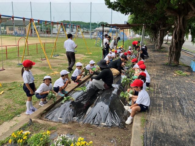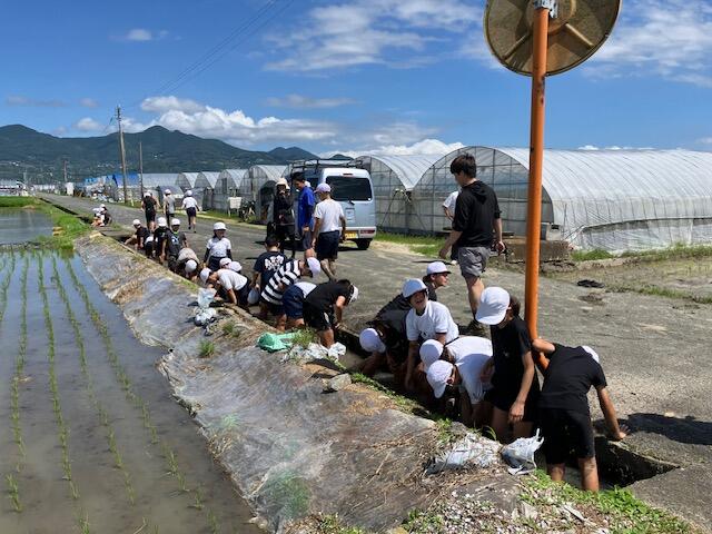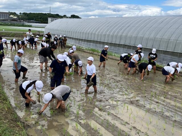 7月4日 5年生は、4Hクラブのご支援で、米作りを行っています。今回は田植えでした。4Hクラブの皆様には, 事前の準備から当日のご指導まで大変お世話になりました。田んぼの中に入るのは初めての子供たちが多く、中に入るだけで大賑わいでした。子供たちには貴重な経験となったと思います。