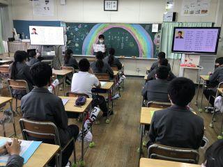2月9日(火)4校時授業を2つ紹介します。まず、3年2組の外国語活動「What.this?これなあに?」です。丁度、フェイスシールドをつけて交流をしているところでした。2つ目は、4年生音楽「日本の音楽に親しもうです」雰囲気を出すために和服を着て指導されていました。