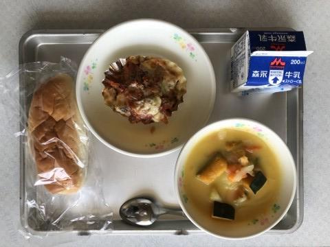 今日のメニューは、①ミルクパン ②かぼちゃスープ ③おさかなピザ ④牛乳です。